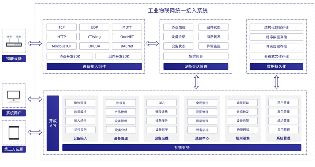 设备接入组件负责与外部物联设备建立连接,支持多种通信协议,如TCP、UDP、HTTP等,使得不同类型的物联设备能够接入系统。 设备会话管理确保设备与系统之间的通信稳定可靠,处理设备的状态变化和异常情况。设备会话管理模块接收来自接入组件的设备信息和数据, 同时它将处理后的数据传递给业务系统进行业务逻辑处理。数据持久化负责将系统收集到的数据进行存储,包括结构化数据、时序数据和日志数据, 以确保数据的长期保存和可追溯性,为业务分析和历史数据查询提供支持。业务系统是系统的核心,负责处理与设备相关的各种业务逻辑, 提供设备全生命周期的管理包括设备接入、设备管理、设备运维、地理中心、规则引擎和系统管理等。 同时业务系统通过API接口与外部系统用户和第三方应用连接,实现数据和服务的交互。
