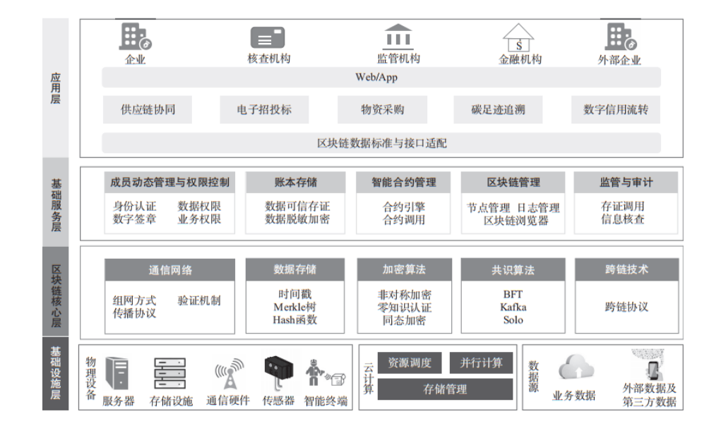 该系统架构融合区块链与企业现有物理设备、云计算资源及数据源,形成物资供应链-区块链融合基础。系统分为四层架构。 基础设施层集成服务器、存储、通信硬件及智能终端,结合云计算提供动态资源,边缘计算优化性能。 区块链核心层涵盖通信网络、Merkle树数据存储、加密算法、共识算法及跨链技术,确保数据安全、一致性及网络互联。 基础服务层提供身份、权限、智能合约、区块链及数据共享管理,支撑应用层需求。应用层通过标准数据接口与模块化服务, 支持供应链协同、采购等业务应用,并通过客户端、门户网站向内外部用户开放。